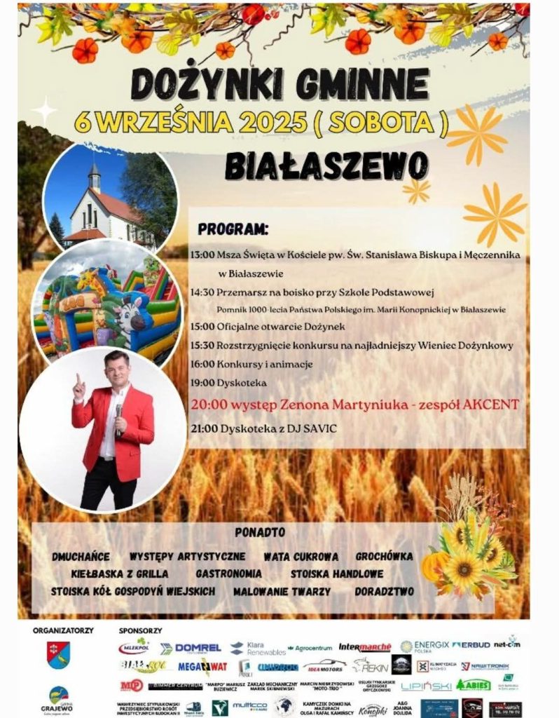 Zaproszenie – Białaszewo – Dożynki Gminne 2025 przez LGD BDN | 2025-08-29 0 komentarzy Białaszewo – Dożynki Gminne 2025 6 września widzimy się na Dożynkach Gminnych w Białaszewie! Start godz. 13:00 Gwiazda wieczoru: Zenon Martyniuk & Akcent Moc atrakcji dla całych rodzin – koncerty, konkursy, dmuchańce, smakołyki i zabawa do późnej nocy! LGD BDN też tam będzie ze swoim stoiskiem promocyjnym – koniecznie zajrzyjcie do nas! Do zobaczenia! Zaproszenie – Dożynki w Białaszewie 6.09.2025 r.